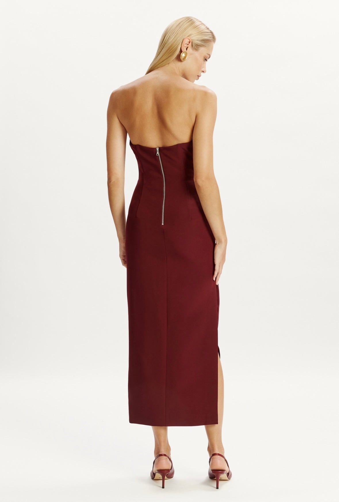 After-dark allure. The Eleni Midi Dress has a plunging yet sculptural neckline that exudes sophisticated sensuality in a bold black hue. Ideal for parties and celebrations.SIZING: True to size. AU: Model wears a size 8 / US: Model wears a size 4.FABRICATION: Main: 95% Polyester, 5% Nylon. Lining: 95% Polyester, 55 Elastane.- Fully lined- Internal boning for structure- Plunging neckline